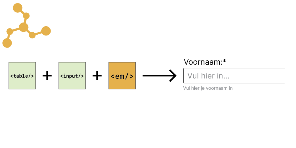 Een groep atomen die aan elkaar verbonden zijn, worden in de scheikunde een molecuul genoemd. Een water molecuul bestaat zo uit twee waterstof atomen en één zuurstof atoom. Hier zouden we kunnen stellen dat een een ‘form-entry’-molecuul bestaat uit een ‘label’-atoom en een ‘input’-atoom.